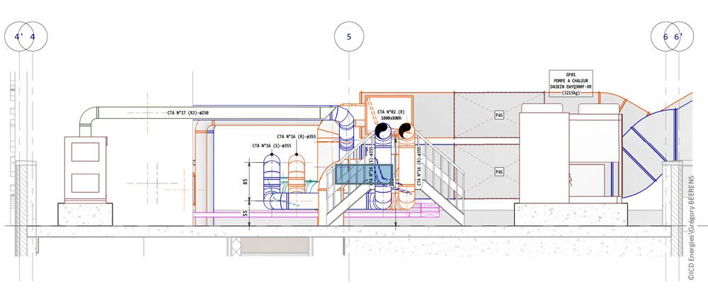 Plan de principe d’une coupe d’implantation du réseau CVC en toiture Sud avec un pont de circulation pour la maintenance – Plan réalisé par Grégory BEERENS, ICD Énergies