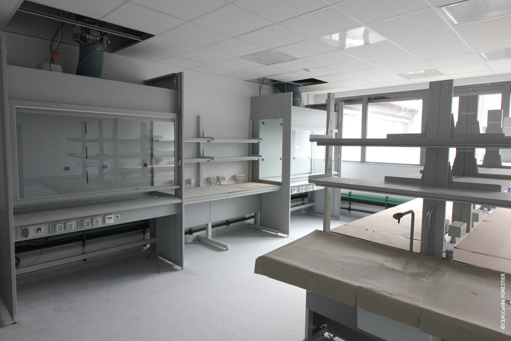 Un laboratoire type dans le futur bâtiment du BIAM : paillasses en émalite équipées d’étagères réglables, prise de courant et prise réseau sur les paillasses, eau chaude eau froide et eau désionisée sur tous les éviers, des sorbonnes dernier cri avec détecteur de présence pour limiter les pertes thermiques, une climatisation et un renouvèlement d’air à raison de 7 fois volume du local par heure, une lumière naturelle en provenance du patio à tous les postes de travail complétée par des dalles de luminaires à LED sur détecteur de présence... Avons-nous oublié quelque chose ? - Crédit photo : Cyrille FORESTIER, CEA
