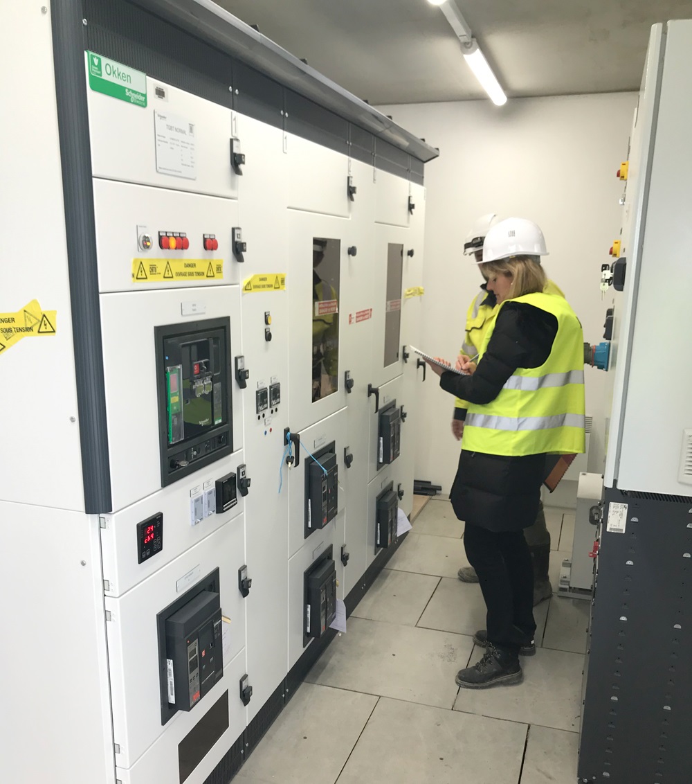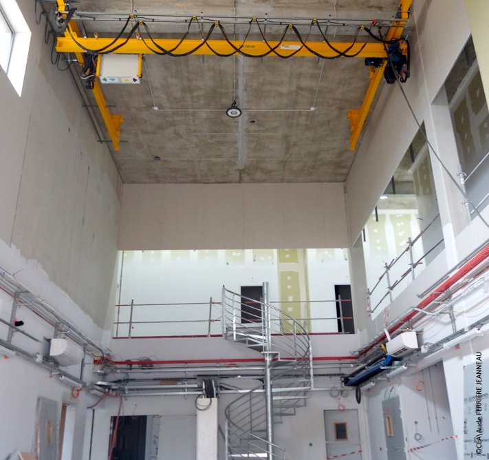 Le génie-civil du poste électrique HT-BT, visible sur la photo précédente, tout comme ses équipements intérieurs sont achevés. Le local renferme des transformateurs, différentes armoires de distribution par étage, mais aussi des dispositifs pour la reprise en secours des alimentations électriques, en cas de coupure ou lors d'opérations de contrôle ou de maintenance. Le poste est aujourd'hui raccordé au bâtiment principal et tous les équipements sont fonctionnels grâce au travail des équipes du groupe SCHNEIDER Electric France, d'EPSYS, coordonné par le groupe électrique du CEA.