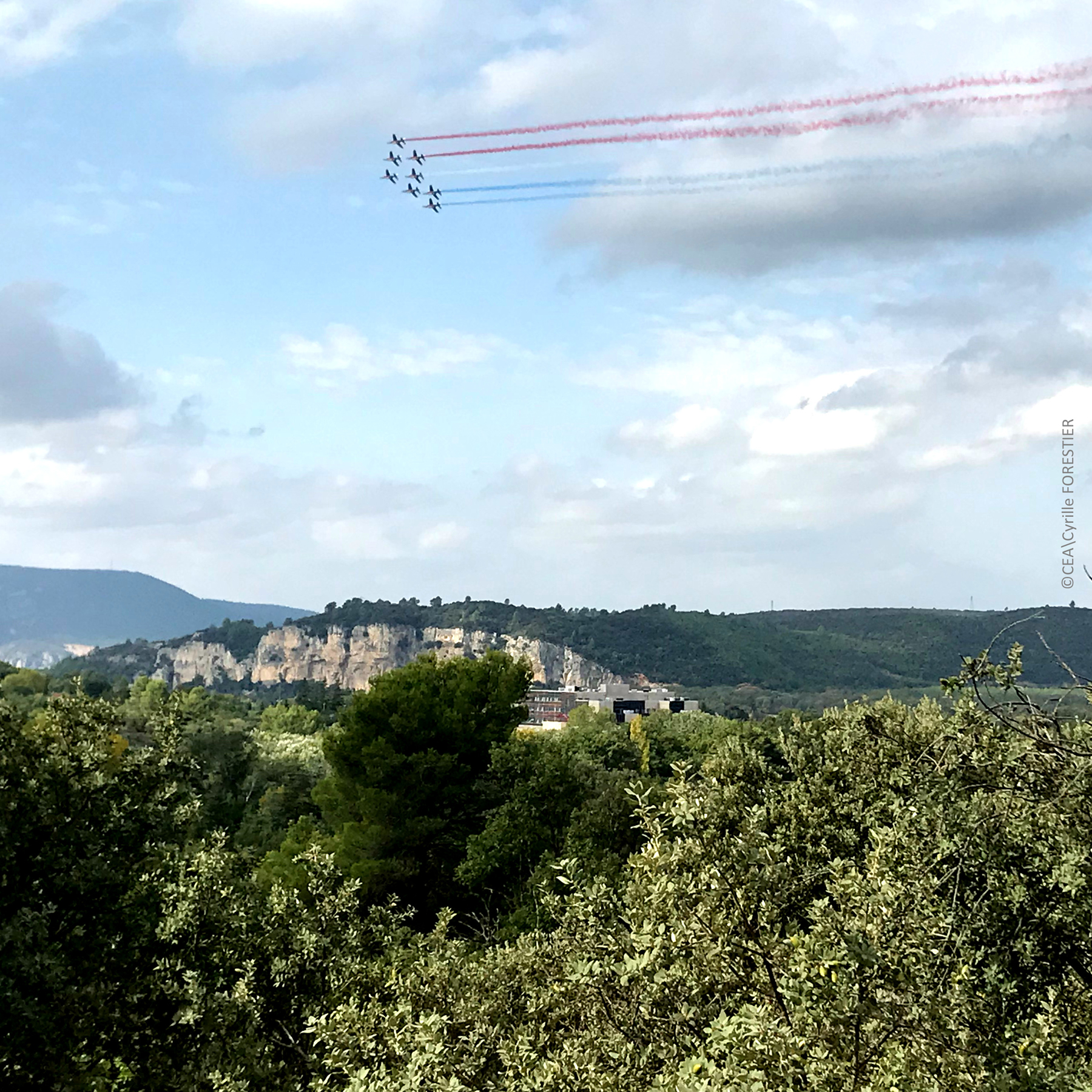 La Patrouille acrobatique de France survole le bâtiment du BIAM – Crédit photo : Cyrille FORESTIER, CEA