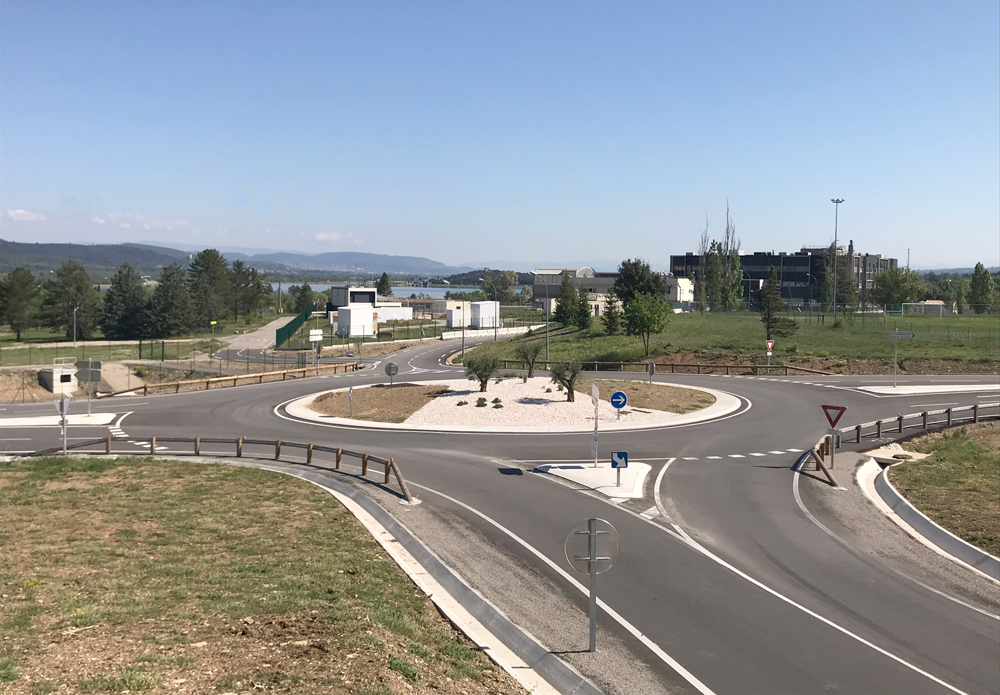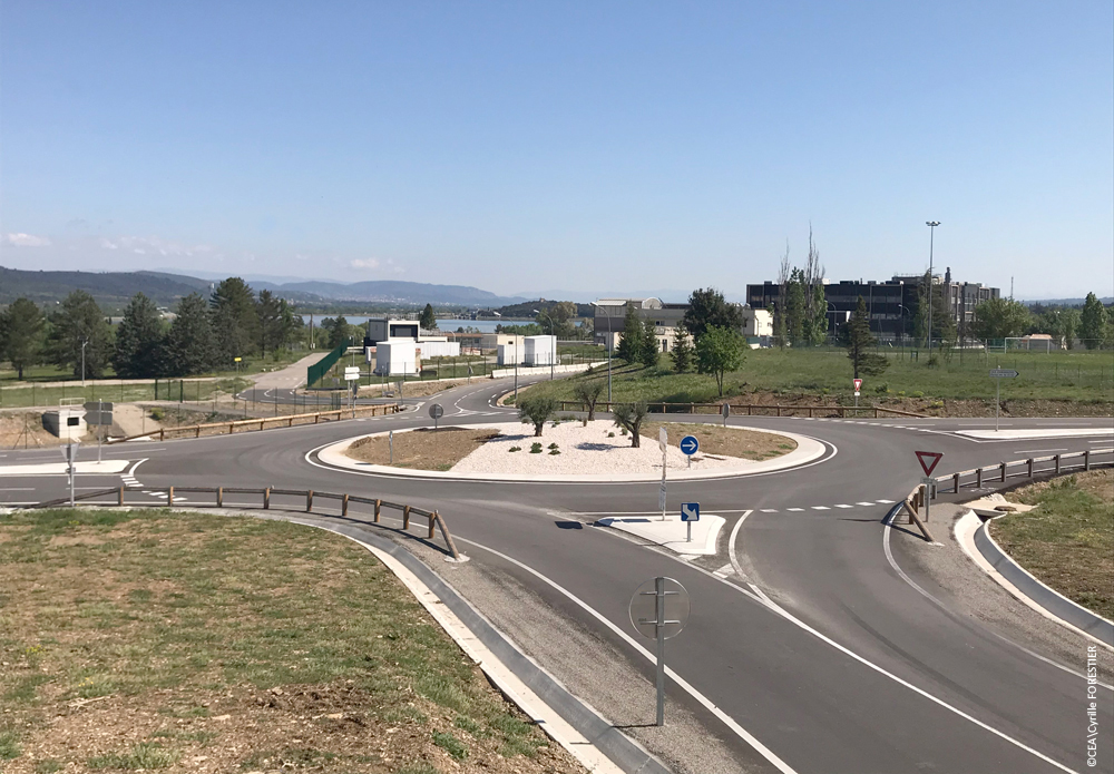 Rond-point desservant la zone « Cité des Énergies » (en face), la RD952 (à gauche), la porte de la Cité (à droite) et la voie de contournement de cette porte vers Rians d’où est pris le cliché - Crédit photo : Cyrille FORESTIER, CEA.