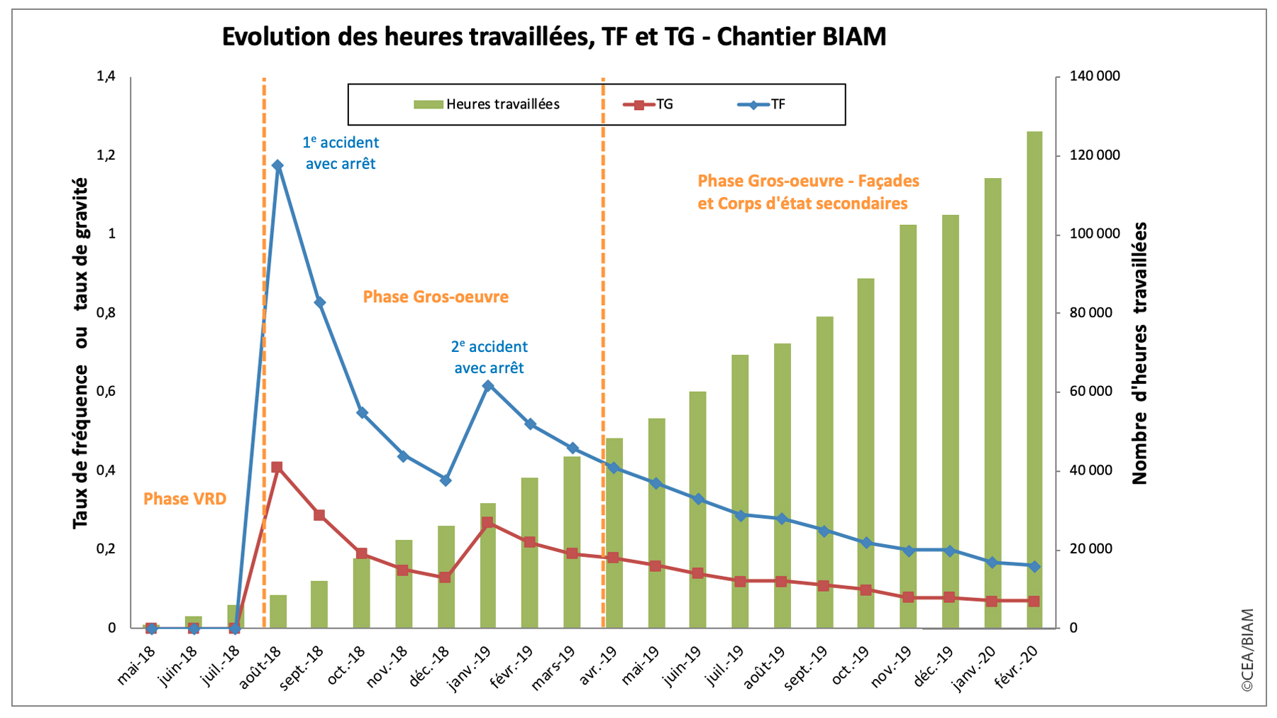Évolution du nombre d’heures travaillées, du taux de fréquence et du taux de gravité des accidents sur le chantier du BIAM depuis avril 2018