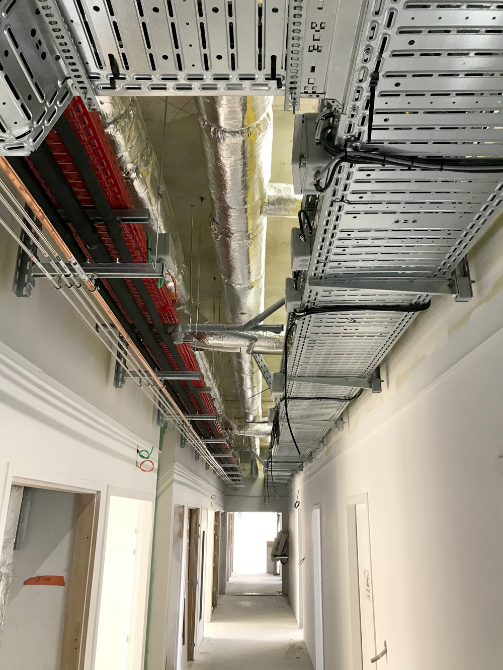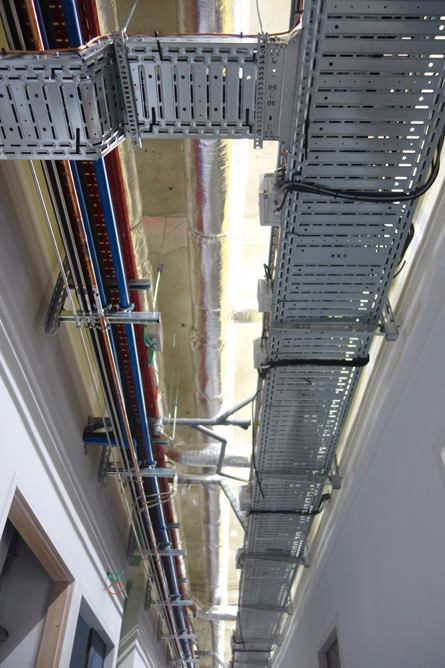 Exemple de chemin de câbles dans les circulations avec les courants faibles et forts (à droite), les gaines de ventilation (au centre) et la plomberie et fluides spéciaux (à gauche) - Crédit photo : Cyrille FORESTIER, CEA