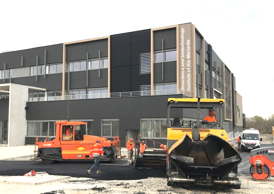 Début mars, la physionomie du terrain aux abords du bâtiment a bien changé ! D'un terrain vague, tantôt poussiéreux, tantôt boueux par jour de pluie, le bâtiment domine maintenant une belle voirie contrastée qui met en valeur les vitrages et bardages du bâtiment. C'est la société VALERIAN-SPIE-BATIGNOLLES qui avait réalisé le terrassement de la parcelle au printemps 2018 (cf.newsletter 2), aidé de la société COLAS, laquelle a réinvesti le chantier pour cette tâche. Aujourd'hui, c'est un vrai plaisir que d'emprunter cette voirie lourde et circulaire autour du bâtiment : fini la poussière soulevée, bonjour la sécurisation des déplacements, des livraisons et des futures interventions pour les secours !