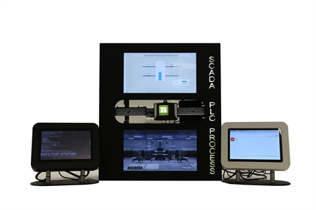 Center: industrial controller managing a physical process visible on the bottom screen and supervised by a SCADA system (top screen). Left console: launches attacks that impact the controller and the physical process. Right console: displays the threat level to the controller calculated in real time by AI.