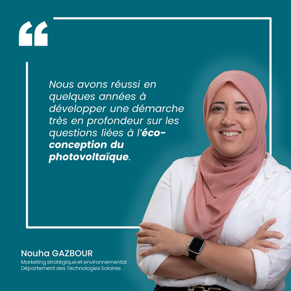 Je suis Nouha Gazbour et je suis responsable du marketing stratégique et environnemental au sein du département des technologies solaire du CEA-Liten, au service des programmes de l'ITE INES.2S.
