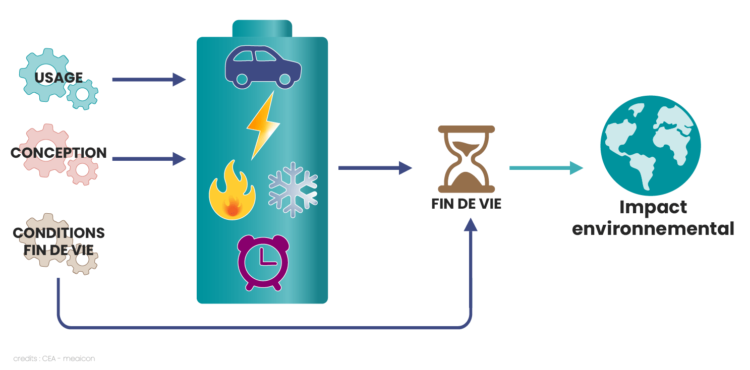 Le CEA est fortement engagé dans la conception des batteries de demain, pour une mobilité électrique performante et durable. Une batterie est un système complexe, qui associe des composants électroniques, mécaniques et également thermiques. Si les méthodes d'éco-conception classiques, telles que l'Analyse de Cycle de Vie (ACV), permettent bien de prendre en compte tous ces composants, elles présentent un biais : les performances et durées de vie considérées en entrée sont forfaitaires. Elles ne permettent donc pas de rendre compte de l'impact d'un changement de conception sur ces deux paramètres.