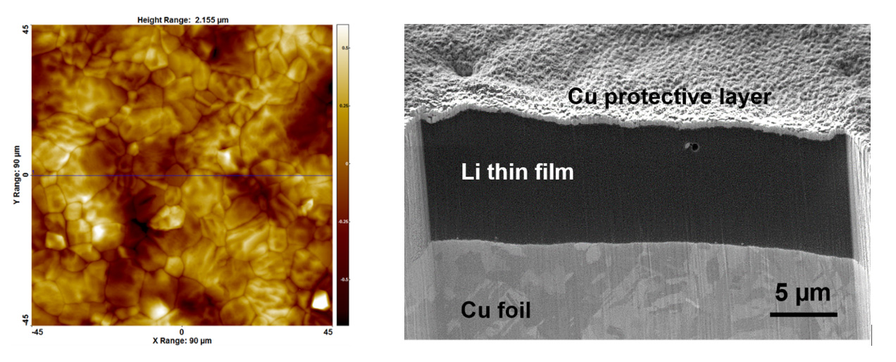 Left: An argon atomic force microscopy image of the surface of Li thin-film deposited by evaporation onto a copper foil. This image shows grain boundaries and Li grains emerging at the Li surface. The roughness obtained is very low, comparable to that of the underlying copper foil.