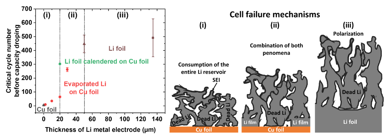 Highlighting of three battery failure mechanisms regarding the Li metal electrode thickness. A positive electrode made from LiNi0.8Mn0.1Co0.1O2 and a liquid electrolyte were used.