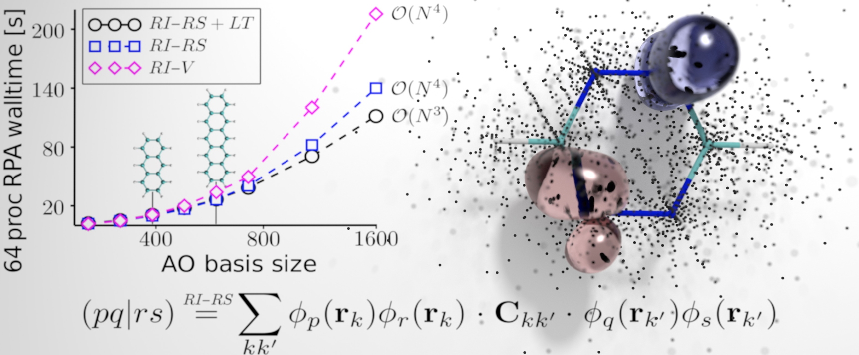 Numerical cost of different GW methods for calculating coulombic interactions as a function of the number of atomic orbits. Illustration of the GW method in real space with the point cloud considered for the benzene molecule.
