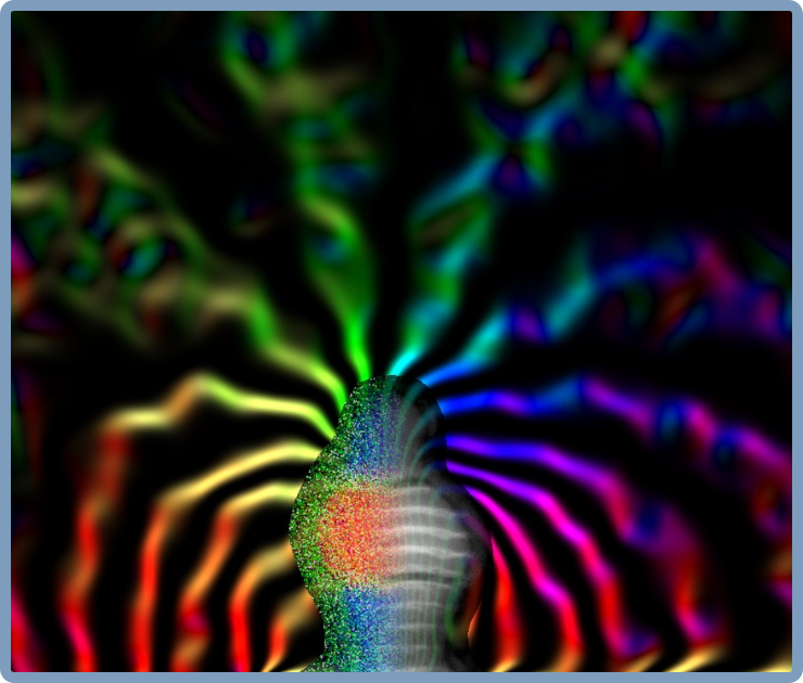 - Une simulation de lignes de champ magnétique émises depuis un nano-pilier intégré à une mémoire magnétique 3D.