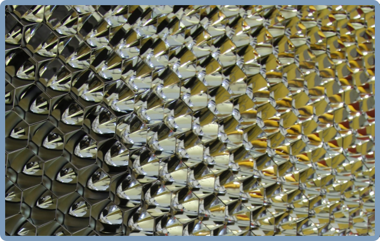 Cette image représente les concentrateurs de lumière installés sur la NectarCam, la caméra qui équipera les télescopes MST (Medium Size Telescopes) de 12 mètres de diamètre de CTAO (Cherenkov Telescope Array Observatory, observatoire du réseau de télescopes Tcherenkov). Ces concentrateurs de lumière sont des dispositifs optiques conçus pour maximiser la collecte de la lumière Cherenkov (produite par les gerbes de particules atmosphériques) et la diriger vers les photodétecteurs de la caméra. Leur forme conique ou pyramidale permet :