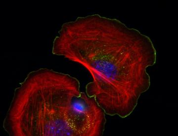Observation de cellules d'embryons de souris au microscope après marquage des noyaux en bleu, des fibres d'actine en rouge et d'Arpin en vert. Arpin se localise à l'extrémité des lamellipodes, là où la membrane cellulaire est en projection. (© Roman Gorelik/CNRS)