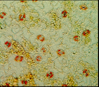 Vue en microscopie optique d'un épiderme de feuille d'Arabidopsisthaliana. Les celules de garde apparaissent en rouge (© Jean-Luc Montillet)