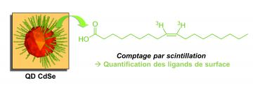 Quel bouquet de ligands serait le mieux à même de fournir toutes les propriétés attendues tout en s’accrochant solidement à la surface du QD ? Le CEA-IBITECS, en collaboration avec l’ESPCI[1] Paris Tech, propose une nouvelle méthode pour tester leur faculté d’adhésion. « Grâce à un marquage isotopique, nous sommes parvenus à quantifier le nombre de ligands s’accrochant à la surface suivant leur nature et la taille des nanocristaux[2] », raconte Eric Doris. Les chercheurs ont ainsi pu établir une cartographie de la surface d’un QD avec toutes sortes de ligands et mis en lumière la compétition entre eux pour coloniser la surface du nanocristal. « Cette hiérarchisation de l’affinité des ligands les plus couramment utilisés permet de mieux appréhender les mécanismes mis en jeu à l’interface entre les ligands et les QD », poursuit le chimiste.