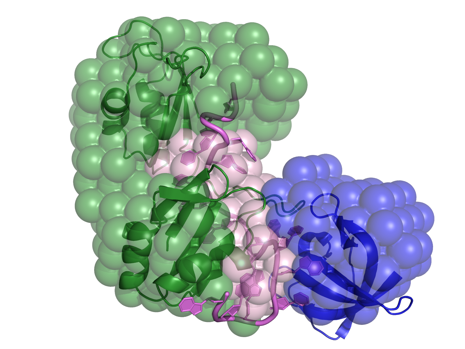 Structure du complexe protéine-protéine-ARN (cristallographie), superposée à des enveloppes provenant des contraintes de diffusion de neutrons (SANS). (c)Frank Gabel, CEA