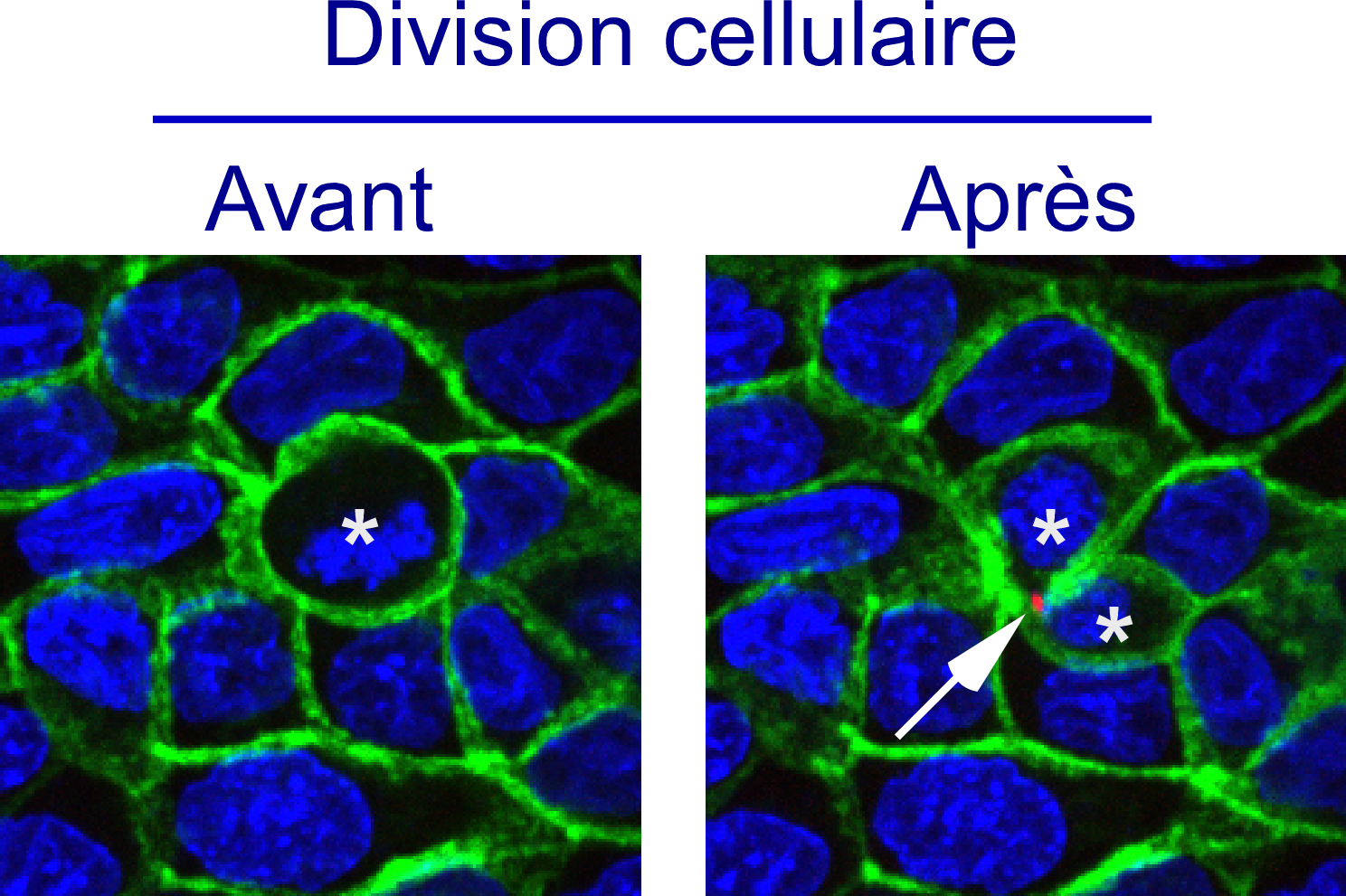 Pénétration d'une bactérie (en rouge) à une jonction cellulaire (en vert) après division cellulaire. (c) CEA