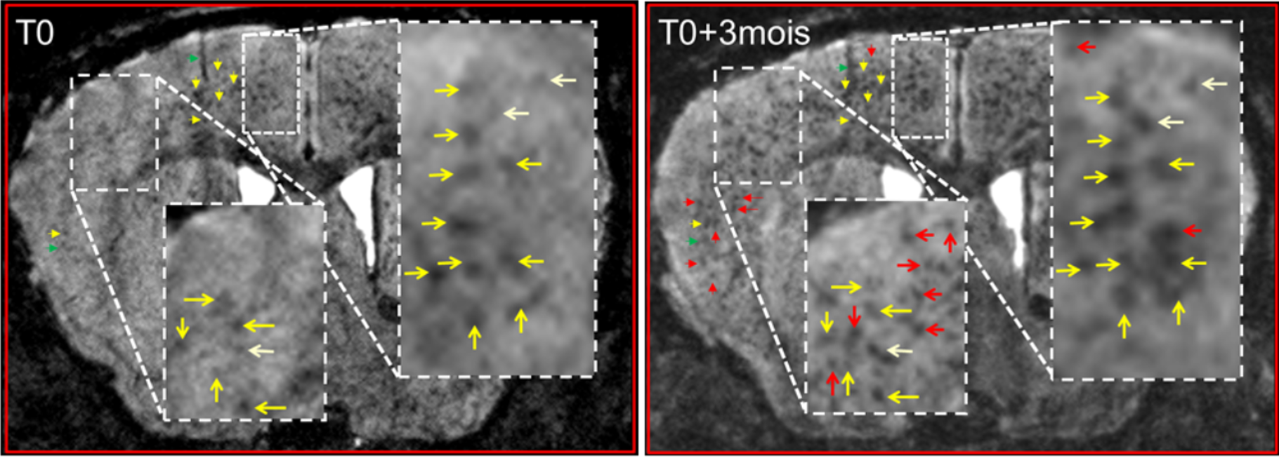 Une équipe du CEA-I2BM, à MIRCen, a développé une technique de microscopie par IRM qui permet de suivre in vivo le devenir des plaques amyloïdes sur un mode longitudinal. Il a utilisé cette méthode pour caractériser le devenir des plaques amyloïdes suite à une immunothérapie, mise au point par Sanofi, ciblant des formes particulières d'amyloïde (appelées protofibrillaires). Cette étude a démontré que les plaques amyloïdes sont des lésions extrêmement stables qui ne disparaissent jamais de façon spontanée. Les examens par IRM ont révélé que la thérapie testée prévient l'apparition de nouvelles plaques amyloïdes et ont permis de mieux caractériser le mécanisme d'action de cette thérapie. Depuis la fin de l'étude, l'immunothérapie est passée en étude clinique, chez l'Homme. La méthode d'IRM développée continue d'être améliorée afin d'être testée en phase préclinique puis à nouveau chez l'Homme.