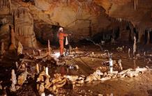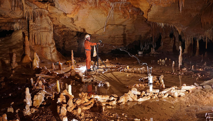 Prise de mesures pour l'étude archéo-magnétique dans la grotte de Bruniquel. © Etienne FABRE – SSAC |