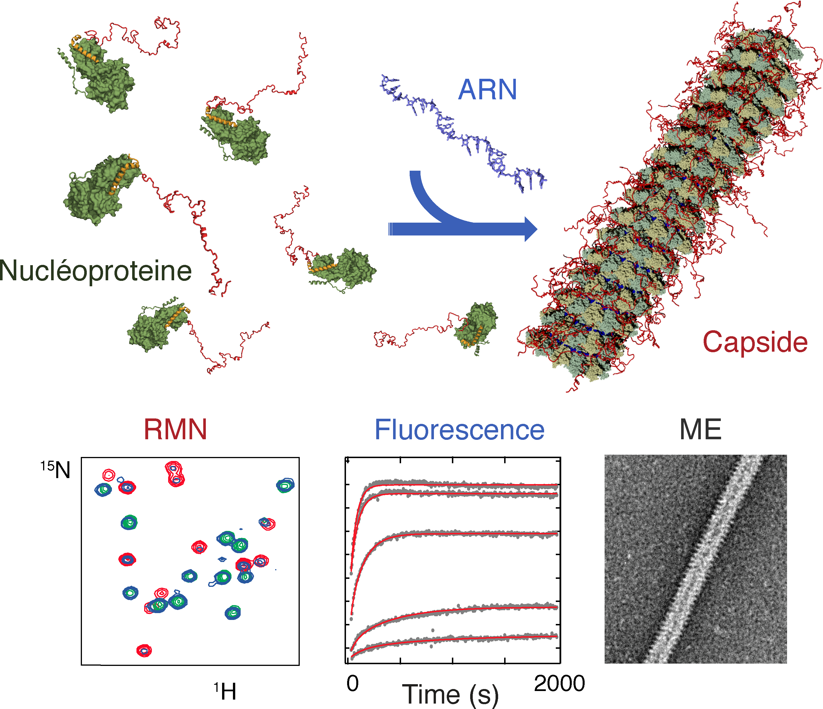 Jusqu'à maintenant, le processus d'assemblage de ces nucléocapsides ("l'encapsidation") n'avait pu être élucidé, faute de pouvoir suivre le processus in vitro. Dans cette étude, des chercheurs de l'IBS à Grenoble décrivent, pour la première fois, de quelle manière se déroule cet assemblage grâce à une combinaison de plusieurs techniques telles que la résonance magnétique nucléaire, la spectroscopie de fluorescence et la microscopie électronique.