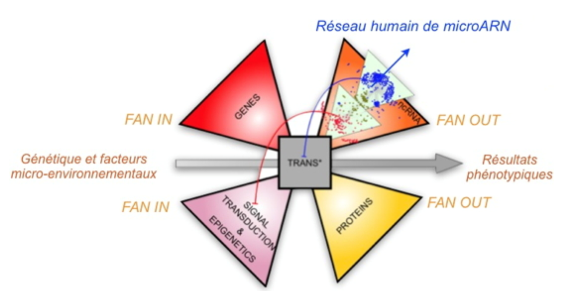 Une architecture en nœud lavallière qui intègre le réseau de miRNA dans un plus large réseau de régulation de l’expression des gènes. Au sein de cette organisation 3 ailes regroupent les acteurs moléculaires, la quatrième traite le flux d’information venant du microenvironnement. Au cœur du nœud lavallière la machinerie de transcription et de traduction (Trans*) est composée de quelques polymérases et de composants universels (nucléotides, acides aminés, ribosomes, etc..). (c) CEA