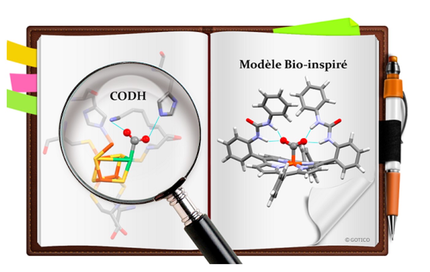 Les chercheurs du CEA-Joliot, en collaboration avec les Universités de Paris Sud et Rennes 1, se sont inspirés de ce site actif naturel et ont utilisé un catalyseur de type porphyrine de fer[1] qu'ils ont modifié en y introduisant des fonctions urée, sortes de piliers moléculaires pourvoyeurs de liaisons hydrogène pour immobiliser le CO2 sur le centre métallique, un peu comme dans l'enzyme naturelle (voir figure). Les résultats sont très prometteurs puisque :