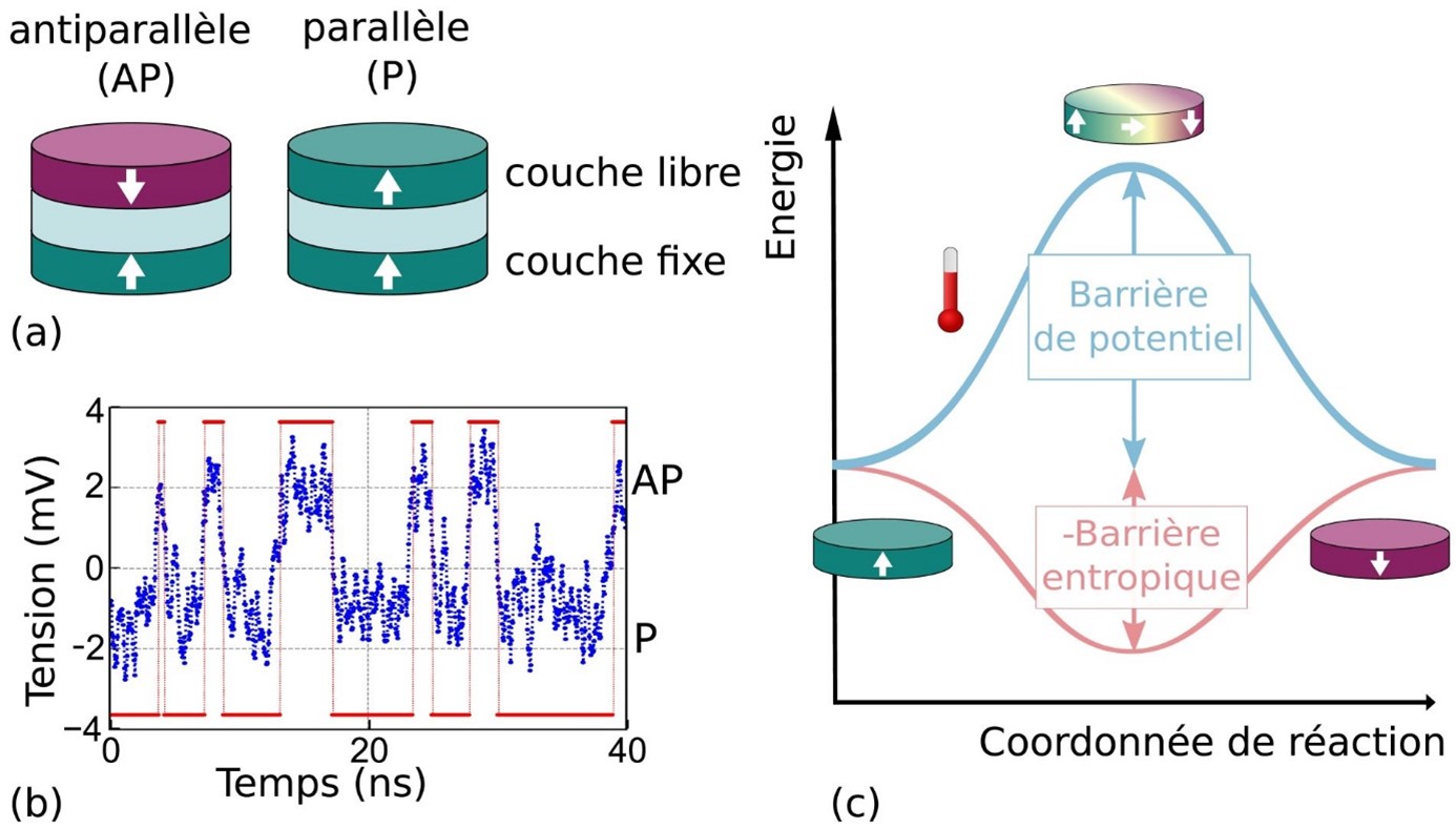 Sous l'effet de la seule énergie thermique, des jonctions tunnel magnétiques perpendiculaires d'un diamètre de quelques dizaines de nanomètres seulement, basculent aléatoirement d'un état à un autre, avec des temps d'attentes moyens ultra brefs, de l'ordre de la nanoseconde. En capitalisant sur ces fluctuations comme mécanisme de renversement d'aimantation, ce travail ouvre la voie à la mise en œuvre d'éléments stochastiques pour le calcul neuromorphique à très faible consommation d'énergie.
