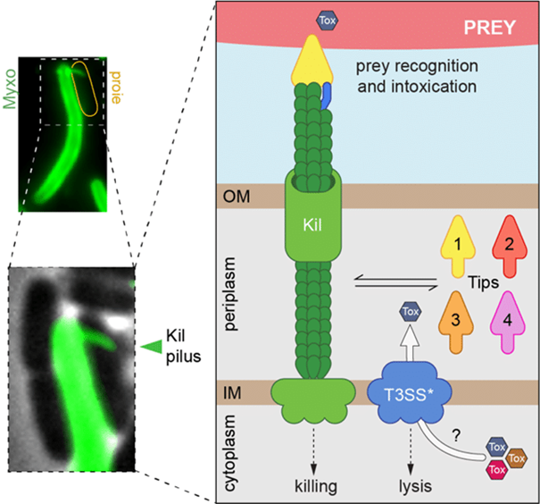 Fait intéressant, le bon fonctionnement de ces embouts dépend aussi d'un autre système intracellulaire appelé T3SS*(Type III Secretion System « sans aiguille »). Ce système est connu pour permettre à certaines bactéries pathogènes d'injecter des protéines dans des cellules hôtes, mais ici, il semble coopérer avec les pili Kil pour permettre la prédation.
