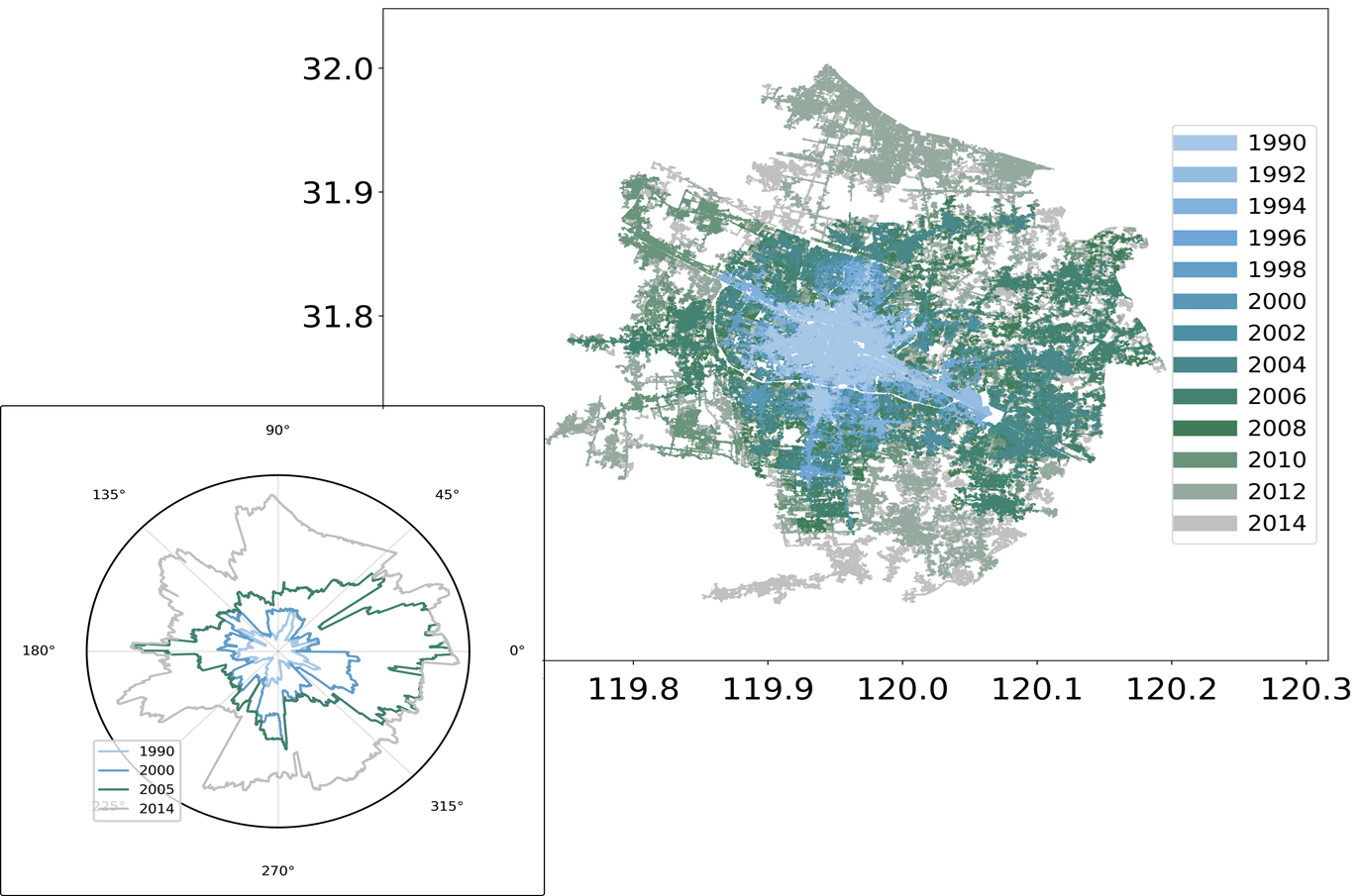 Figure 1 : Exemple de croissance isotrope (Changzhou, Chine). Encart : la croissance de la composante géante connectée.