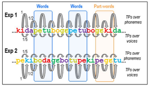Les nouveau-nés peuvent segmenter un flux continu de parole en utilisant les probabilités de transition entre syllabes : ils évaluent la fréquence à laquelle une syllabe suit une autre pour segmenter un discours. Ils repèrent ainsi les évènements qui ont une haute probabilité de se suivre. Ce mécanisme simple fait partie de la boîte à outils du nourrisson humain pour découvrir des régularités dans la parole. Des recherches récentes montrent que cette capacité s'observe pour d'autres apprentissages (sons non vocaux comme les tonalités, formes visuelles, actions), ainsi que dans différentes espèces.