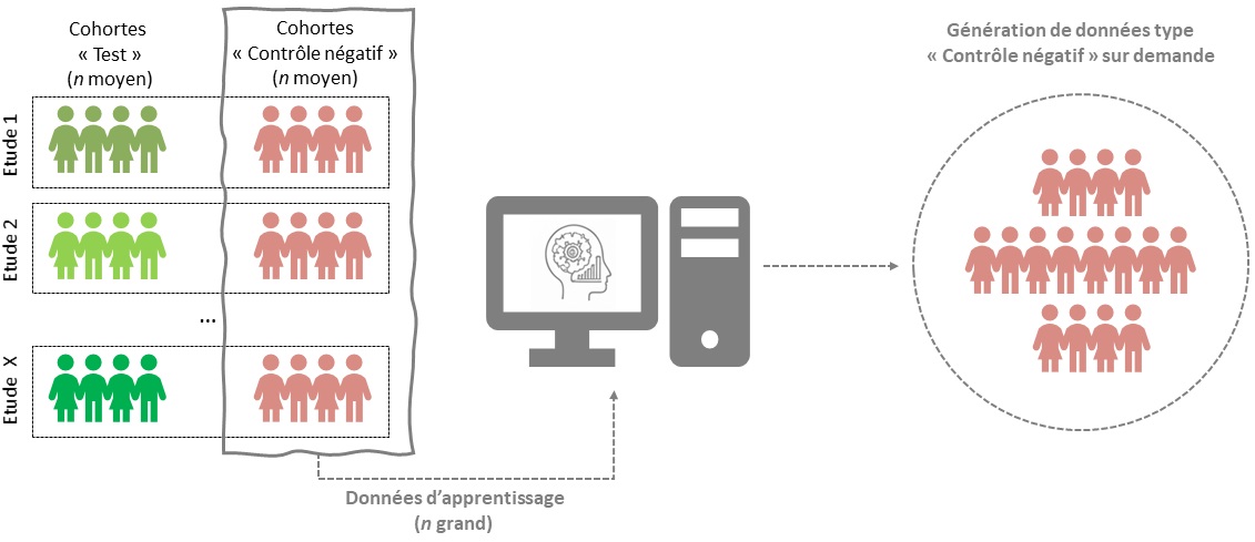 Compléter une cohorte en générant des données supplémentaires sur des patients dans le groupe de patients malades (groupe « test », en vert sur le schéma) serait très risqué, car toute hallucination non détectée conduirait à une représentation biaisée de la maladie. À l'inverse, compléter le groupe de patients sains (groupe « contrôle négatif », en rouge sur le schéma) qui sert de contrôle dans l'étude peut être conforme à une politique d'atténuation des risques : premièrement, parce que les hallucinations non détectées entraîneraient ici une plus grande diversité au sein du groupe de contrôle, ce qui est connu pour être un moyen efficace de limiter les risques de fausses découvertes. Ensuite, parce que les patients sains ont été admis plus fréquemment dans les études de cohorte, de sorte que les données potentiellement disponibles pour entraîner l'IA sont plus importantes, plus robustes et plus cohérentes.
