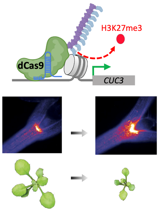 La marque épigénétique H3K27me3, modification chromatinienne conservée chez les eucaryotes multicellulaires, est fortement associée à la répression des gènes développementaux. L'étude démontre sa fonction exacte chez les plantes par le recrutement ciblé, via dCas9, d'une activité enzymatique sur le gène développemental CUP SHAPED COTYLEDON 3 (CUC3) d'Arabidopsis thaliana, en utilisant un outil d'édition épigénétique. Le retrait de la marque H3K27me3 induit une transcription plus étendue de CUC3 dans les tissus de la plante, entraînant une altération de la morphologie des feuilles et la production d'inflorescences bifides.