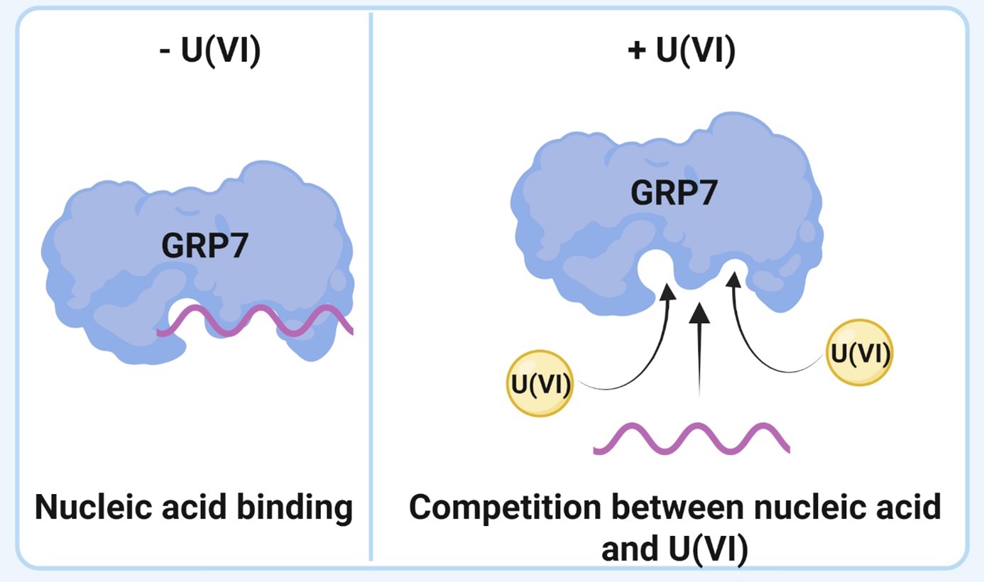 Grâce à une approche de métalloprotéomique intégrée (qui permet d'étudier l'ensemble des protéines contenant un ou plusieurs ions métalliques d'un organisme ou extrait cellulaire), combinant chromatographie, spectrométrie de masse et spectroscopie de résonance magnétique nucléaire, les chercheurs ont identifié à partir d'extraits cellulaires d'Arabidopsis thaliana 57 protéines capables de se lier à l'uranium. L'une d'elles, GRP7, joue un rôle clé dans la régulation des ARN. L'étude montre que l'uranium se fixe sur deux sites précis de cette protéine et empêche son interaction normale avec les acides nucléiques, perturbant ainsi la régulation de l'expression des gènes.
