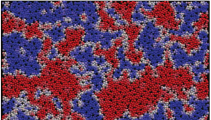 Visualisation de la transformation d'un verre (en bleu) en liquide (en rouge) après une remontée soudaine de la température. (Crédit : G. M. Hocky, L. Berthier, and D. R. Reichman Equilibrium ultrastable glasses produced by random pinning J. Chem. Phys. 141, 224503 2014)