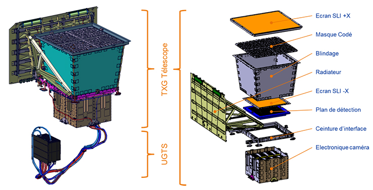 - d'un télescope X et gamma à grand champ de vue (89° x 89°) doté d'un masque codé, d'un blindage passif et d'un plan de détection refroidi à -20°C,