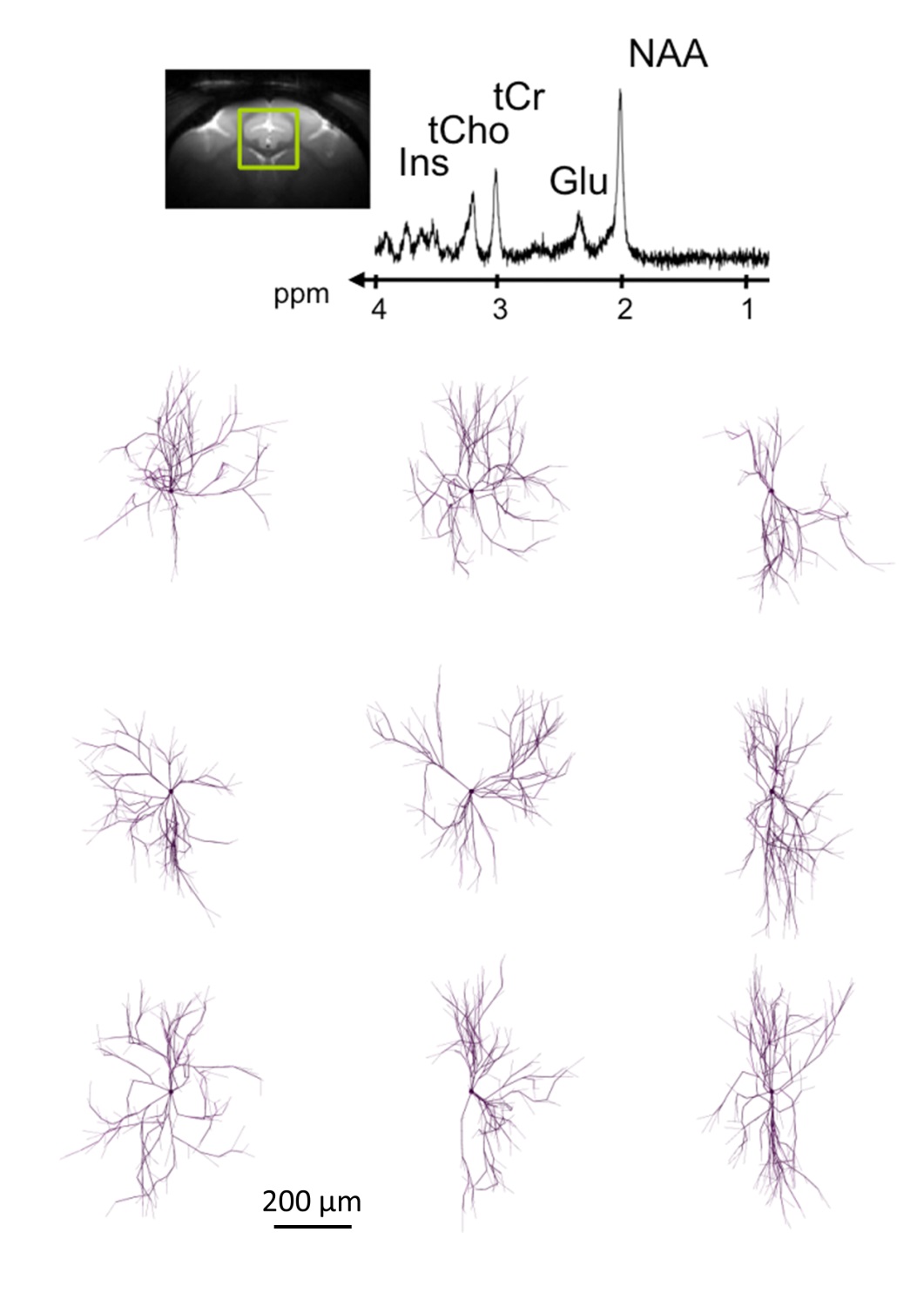 En haut : La diffusion des molécules intracellulaires est mesurée dans un volume cérébral (ici, dans la boîte représentée en vert dans le cerveau de primate) par spectroscopie par résonance magnétique in vivo. En bas : En modélisant la diffusion de ces molécules par simulations numériques, des « cellules virtuelles » peuvent être reconstruites, dont les caractéristiques morphologiques moyennes dépendent de la diffusion intracellulaire mesurée (ici, cellules reconstruites à partir de la diffusion de la créatine, notée tCr sur le spectre).