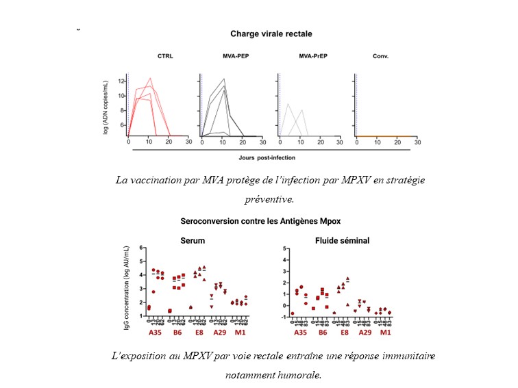 Pour répondre à cet enjeu, le Département IDMIT a développé un modèle expérimental dans un modèle animal primate. Les animaux ont été infectés par voie rectale avec une souche de MPXV clade IIb isolée en 2022. Ce modèle a permis de reproduire de façon fidèle plusieurs caractéristiques observées chez l'homme : une infection rectale locale, des lésions cutanées et muqueuses, une dissémination systémique du virus et, point majeur, une excrétion prolongée dans le sperme et les fluides rectaux, confirmant la pertinence de ce modèle pour étudier la transmission sexuelle.
