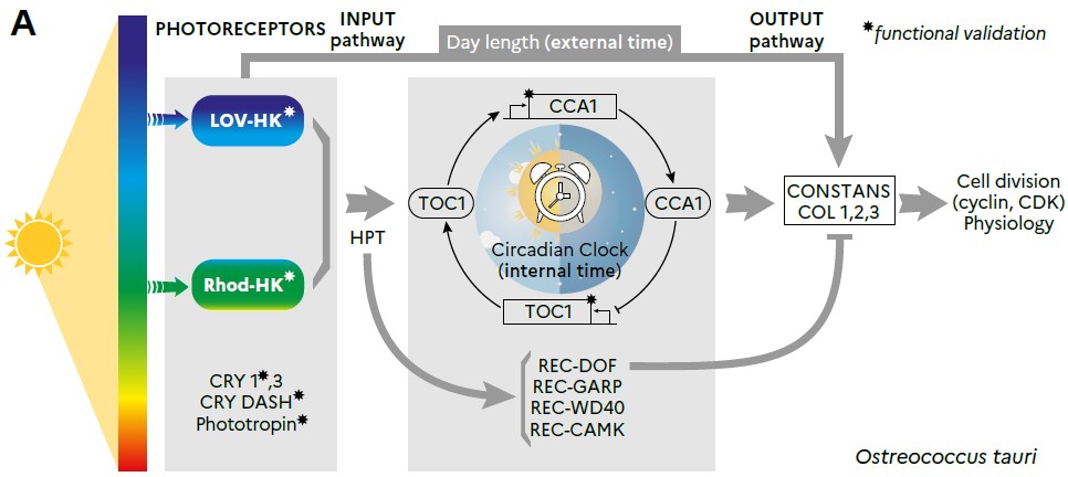 Les analyses phylogénétiques mettent en évidence une forte diversification des photorécepteurs, en particulier chez le genre Micromonas, ainsi qu'une grande variabilité des protéines à domaine CCT, une famille clé impliquée dans la régulation circadienne et le photopériodisme chez les plantes. Un résultat marquant concerne la protéine TOC1, composant central de l'horloge circadienne chez Ostreococcus tauri. Les auteurs montrent que TOC1 est soit absent, soit fortement tronqué chez certaines espèces tropicales, notamment Ostreococcus sp. RCC809.