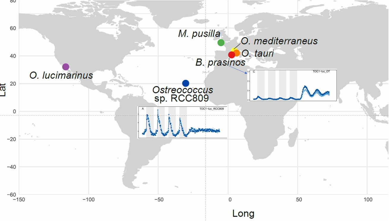 Pour évaluer les conséquences fonctionnelles de cette divergence, des approches expérimentales basées sur des lignées rapporteurs luciférase ont été mises en œuvre. Elles révèlent que, chez la souche tropicale Ostreococcus sp. RCC809, l'oscillateur circadien TOC1/CCA1 n'est plus fonctionnel, contrairement aux espèces de latitudes tempérées. Ces observations suggèrent que certains mécanismes circadiens centraux peuvent devenir dispensables dans des environnements où la durée du jour varie peu au cours de l'année.