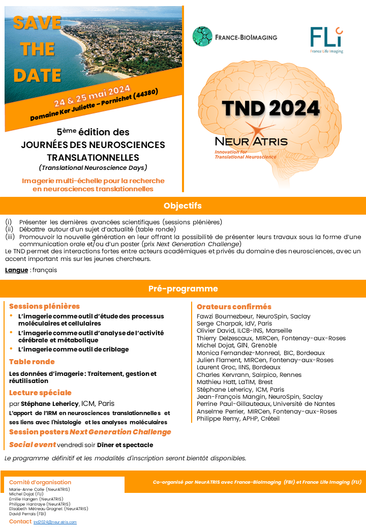 Co-organisée avec les infrastructures NeurATRIS, France-BioImaging (FBI) et France Life Imaging (FLI) , cette édition se déroulera sur la journée complète du vendredi 24 mai et la matinée du samedi 25 mai et aura pour thème l’imagerie multi-échelle pour la recherche en neurosciences translationnelles.