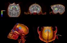 3D reconstruction of a whole-body CT acquisition superimposed on a 3D PET image. The CT scan shows the skeletal anatomy of the rodent, while the PET image (in color) displays the whole-body biodistribution of a radioligand. Organs in which the radioligand accumulates most intensely appear in colors tending toward red, while areas with low radioactivity are shown in dark blue. This study aimed to assess the biodistribution of a new PET radioligand across whole-body organs.