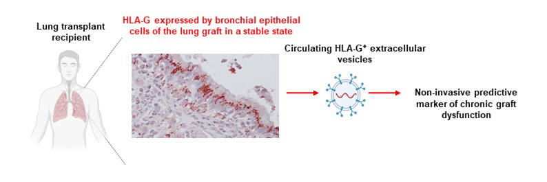 The HLA-G molecule is well known for its immunomodulatory properties and its association with states of immune tolerance. While HLA-G expression within the lung graft has already been correlated with improved graft acceptance, measurements of soluble plasma HLA-G have proven to be poorly informative. The authors therefore hypothesized that the vesicular form of HLA-G, transported by circulating extracellular vesicles, could provide a more accurate reflection of the graft’s immunological status.