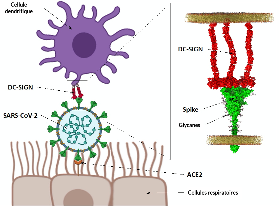 Les scientifiques ont montré que cette interaction ne causait pas l’infection directe des cellules par le SARS-CoV-2. Par contre, parmi ces récepteurs, DC-SIGN et L-SIGN sont capables, une fois qu’ils ont accroché le virus à la cellule, de le transmettre aux cellules permissives possédant ACE2.