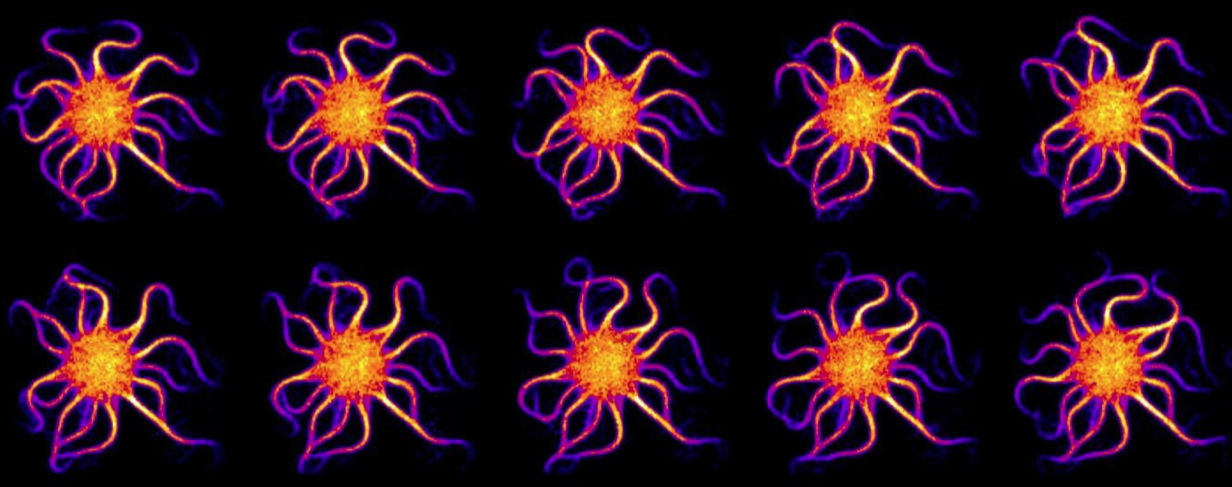 Un flagelle est constitué d’une structure de filaments parallèles — les microtubules. Des moteurs moléculaires, les dynéines, forment des liens entre les filaments. En se mettant sous tension, ils forcent les filaments à coulisser les uns par rapport aux autres. Ce mouvement, lorsqu’il est bien coordonné, créé des ondulations régulières et rythmées du flagelle. Depuis des décennies, les chercheurs visent à comprendre la manière dont les filaments et les moteurs moléculaires arrivent à s’auto-organiser pour créer ce mouvement régulier dans le temps et dans l’espace.