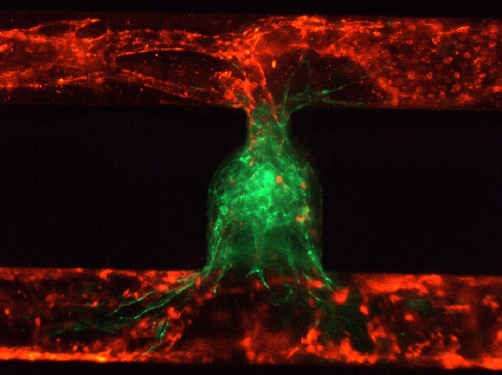 Image 1 : organoïde vascularisé dans la puce microfluidique (crédit CEA).​