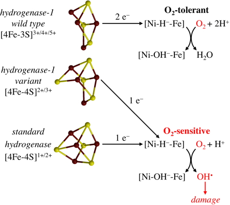 Les hydrogénases sont des enzymes d’un intérêt considérable pour leurs applications biotechnologiques potentielles à la fois en tant que catalyseurs dans des piles à combustible que productrices d’hydrogène. Cependant, ces applications peuvent être grandement affectées par leurs réactions avec l’oxygène atmosphérique.