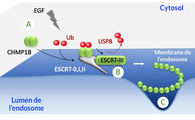 Les travaux de l’équipe Génétique & Chemogénomique du laboratoire Biologie à Grande échelle, menés en collaboration avec l’IBS, ont montré qu’une protéine du complexe endocytaire (CHMP1B) est ubiquitinée de façon dynamique dans les 5 à 10 minutes qui suivent une stimulation des cellules par l'EGF, un facteur de croissance cellulaire (Figure). Cette ubiquitination s'avère nécessaire pour la fonction de CHMP1B dans le trafic intracellulaire dans des cellules humaines en culture, ainsi que pour la morphogenèse de l’aile chez la drosophile. Les résultats obtenus montrent également que CHMP1B est une cible de l’enzyme USP8 qui, en déubiquitinant CHMP1B, pourrait favoriser sa polymérisation au niveau de la membrane des endosomes (Figure).