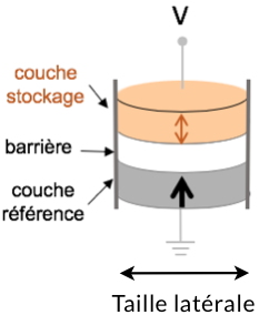 Les mémoires magnétiques à accès aléatoire (MRAM) sont des dispositifs spintroniques alliant la non-volatilité (conserve ses données en l'absence d'alimentation électrique), la rapidité et la robustesse face aux radiations. Elles sont destinées à devenir une des briques de base des futurs processeurs et/ou architectures néuromorphiques (ou réseau de neurones). Au cœur du composant, il y a une jonction tunnel magnétique constituée de deux couches ferromagnétiques (de référence et de stockage) séparées par une barrière isolante (Figure 1). Les approches les plus prometteuses privilégient la configuration des jonctions tunnels magnétiques dite perpendiculaire pour laquelle les aimantations de deux couches ferromagnétiques sont perpendiculaires à leur plan.