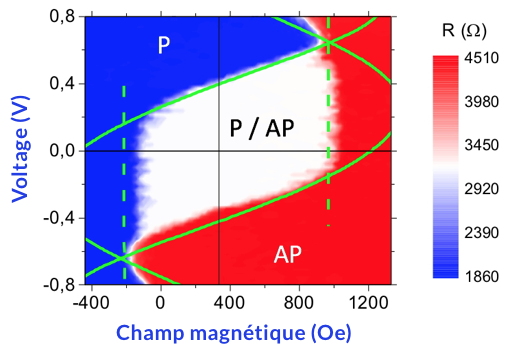 Figure 2 : Diagramme champ-tension mesuré expérimentalement La couleur bleue indique l’état parallèle des 2 couches ferromagnétiques (P, basse résistance électrique), le rouge indique l’état anti-parallèle (AP, haute résistance électrique). Le blanc est la zone de bi-stabilité (P/AP). Les lignes vertes sont les lignes de stabilité issues de la modélisation.
