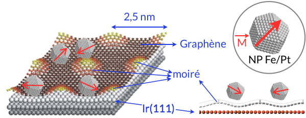 collaboré avec ceux de l’Institut Lumière Matière de Lyon capables de réaliser des nano-particules de fer-platine qui, moyennant un recuit, s’organisent chimiquement à l’échelle atomique et acquièrent une aimantation. Ils ont alors montré que non seulement ces particules s’organisent sur le réseau de